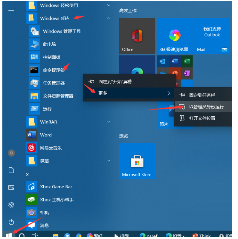 点击电脑左下角的开始菜单-找到windows系统-右击命令提示符 ,选择更多,以管理员身份运行