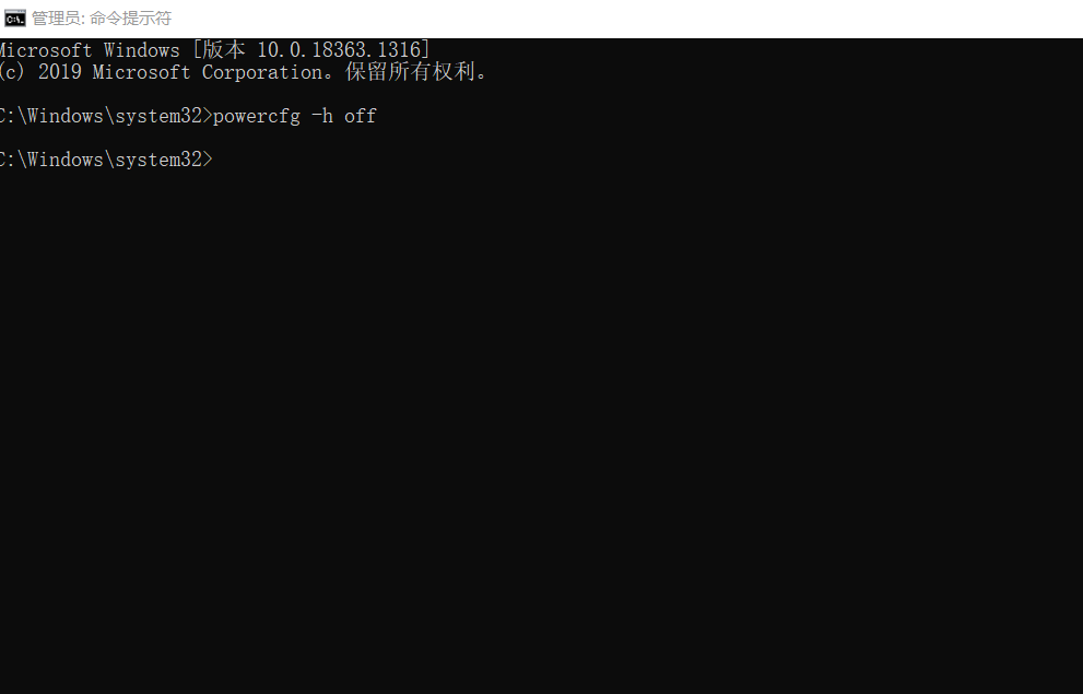 在打开的命令提示符输入 powercfg -h off 按回车即可